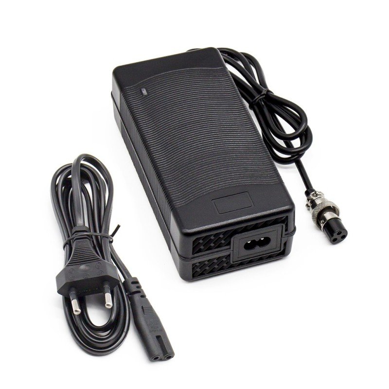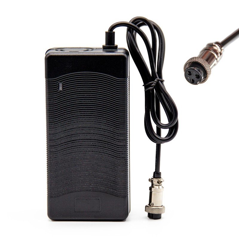 Cargador estándar con refrigeración por ventilador. Diseñado para trabajar 24h seguidas. Recomendado para baterías con capacidad de 4 a 15 Ah. Tiempos de carga entre 2 y 8 horas, dependiendo de la batería. Voltaje máximo: 54.6V Corriente de carga: 3A Conector: GX16.